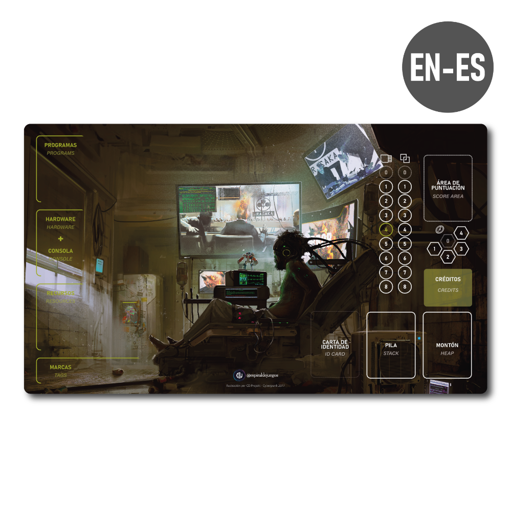 Diseño de tapete para Jugador Runner Multilenguaje especialmente pensado para la perfecta colocación de las cartas y tokens de Runner en partidas contra el mazo de Automa Corporación de SAG. Sirve para jugar en solitario o competitivo.